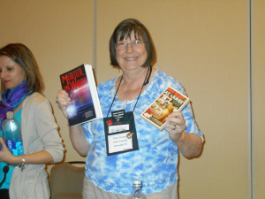 Kaye George/Janet Cantrell holds up copies of Austin Mystery Writers’ Murder on Wheels and Janet Cantrell’s Fat Cat Spreads Out.