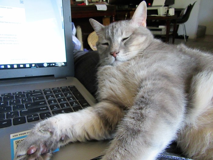 Finally he tires and collapses, on the keyboard if possible. Once in a while he hits the Enter key. His rear has sent several unfinished emails. If I’m lucky, he turns over so his tummy is exposed for easier rubbing. If I’m luckier, he oozes down to the footrest.