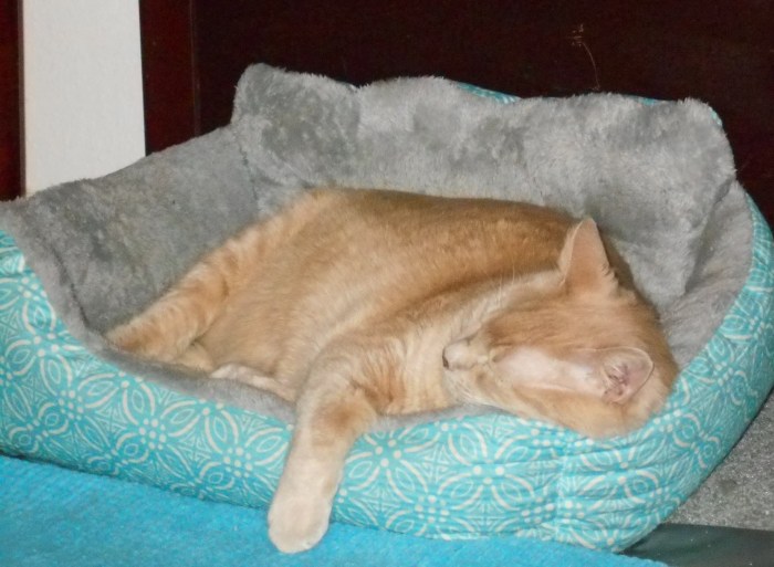 I took photos. They didn’t turn out–angle and proximity made it hard to get a good shot–but you might be able to get hint of our predicament. My predicament, really. As long as I rubbed his tummy, he didn’t care where he was. I don’t think he even noticed.