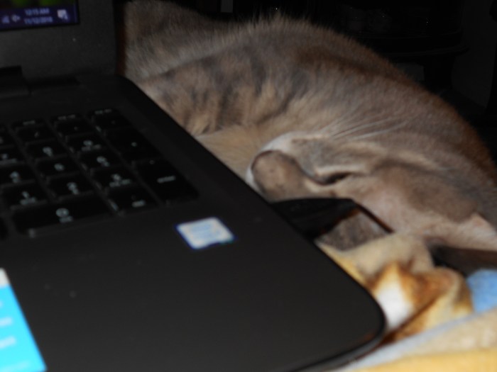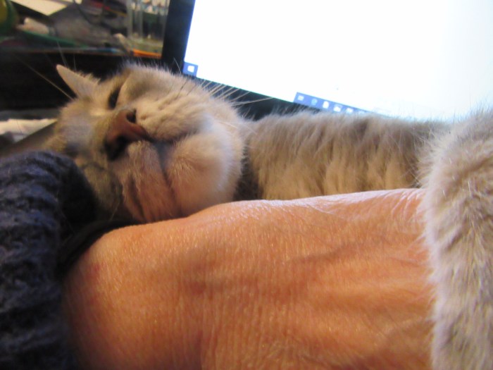 And he’s a Velcro cat. He can’t help that I have to move the laptop waaaaay over to the left and stretch sideways to reach the keyboard. He needs almost constant physical contact. Denying him my lap could crush his spirit. He’s sensitive.