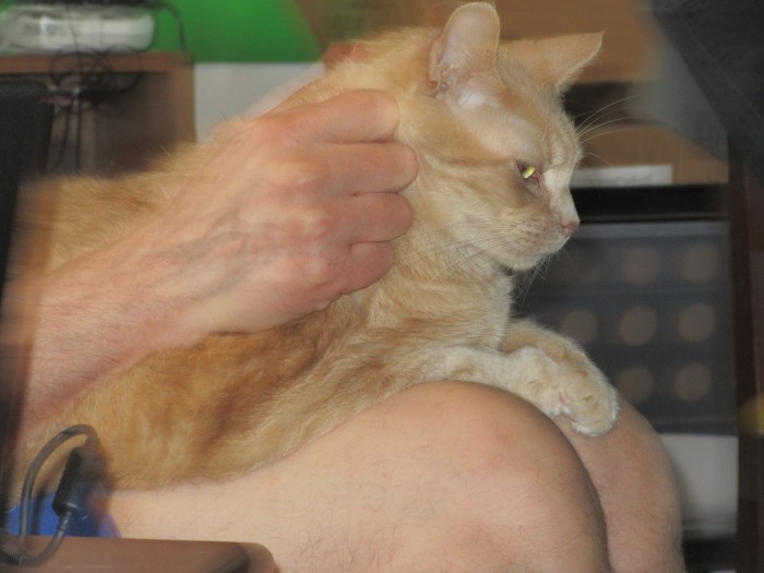 Lately he’s been doing it again, and I’ve realized he just wants to be petted. But he doesn’t want to give up the chair. I feel guilty for not snuggling with him nine years ago, so I push and pull him to one side of the chair and squeeze into the other–it’s a big chair, and we almost fit. Sometimes he stays wedged between me and the arm. Sometimes he struggles to crawl around to my lap.