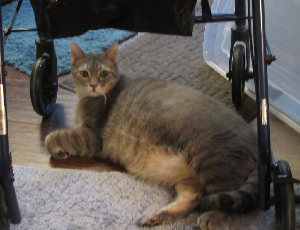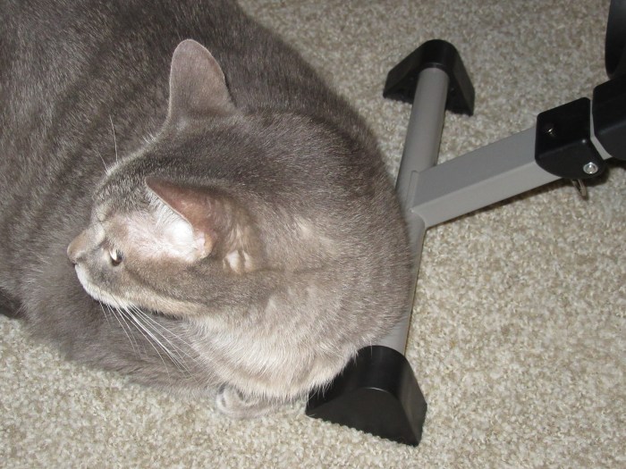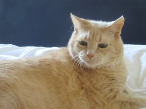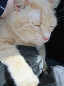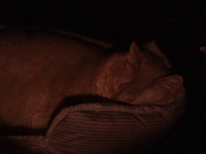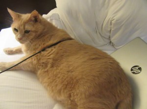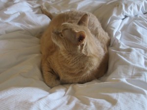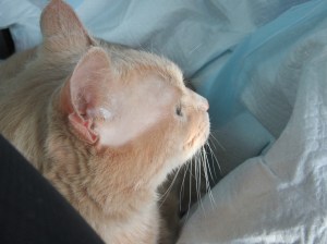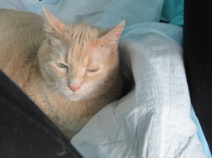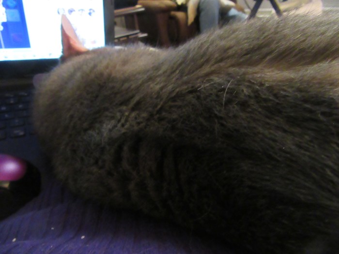 Ernest also pulled a couple of loose pages from my novel manuscript, which is in a binder on the floor beside my chair, and chewed the corner off one. Last night he slept on the other one. I haven’t had the energy to pick them up. Anything he eats can be reprinted, and paper biodegrades inside cats. I hope. As long as he doesn’t eat string or thread or anything else that could cut into his GI tract and require CT scans and possibly surgery. So far we’ve been lucky. Just scans and enemas.
