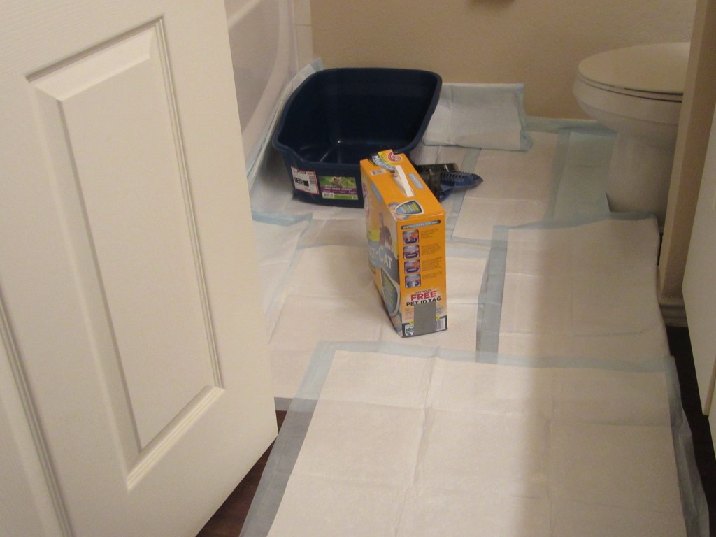 David deposited me here and went back to meet the movers. He incarcerated the cats in a bathroom. Yesterday I prepped it. Cats don’t usually need puppy pads, but Ernest throws litter all over the place. Still, I might have overdone it.