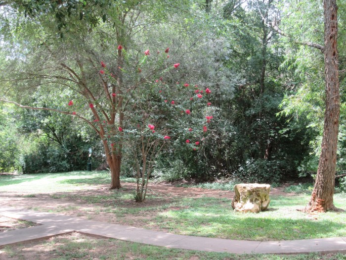 I sit in the new living room, in my wheelchair, the only chair in the apartment, looking out across the balcony at the new view—sidewalk, pink crepe myrtle, grass, trees, and a stone.