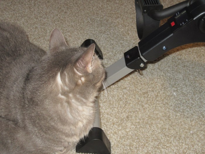 That was a long time ago, when they were kittens. Now they run under the bed, mostly for the maintenance man. Ernest disappears when he hears leaf blowers. William is not impressed by lawn care.