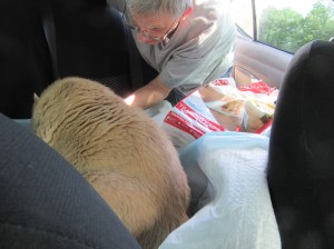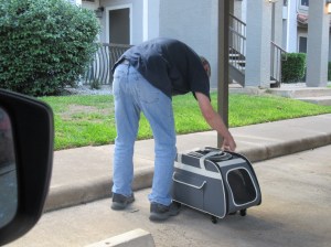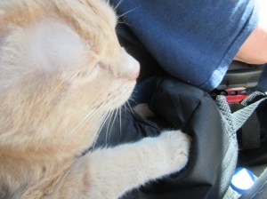 Cocoon, Day 3: less artfully constructed than on Day 1Blocked from getting in floor; plowing through to front seat; blocked againIntrepid explorer; access to front seat still blockedCruising againTired, bored, or resigned to being blocked; snoozing on the interstatePreparing for touchdownThe last leg of the journey