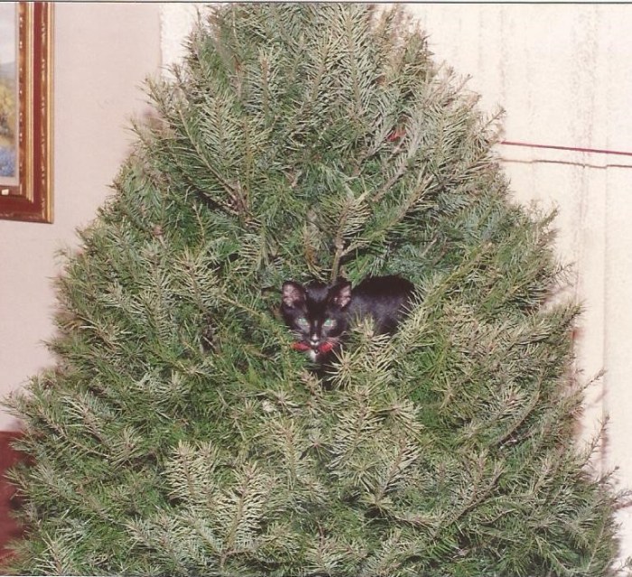 Christmas trees have always been problematic. When we were first married, we had a tree tree. Six-month-old Chloe walked it like a spiral staircase and perched among the branches. We had to close her up in the bedroom so we could decorate. In fact, we had to close her up in the bedroom so we could get it into the stand.
