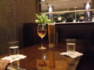 So David ordered a Stella Artois for himself and ordered me a glass-and-a-half of Fleur de Mer. That’s nine ounces as opposed to a glass, which is six. I don’t like most wine, but rosé isn’t bad. A dessert wine I had at a Greek restaurant years ago was excellent, but I’ve forgotten what it was, so I’m stuck with rosé.