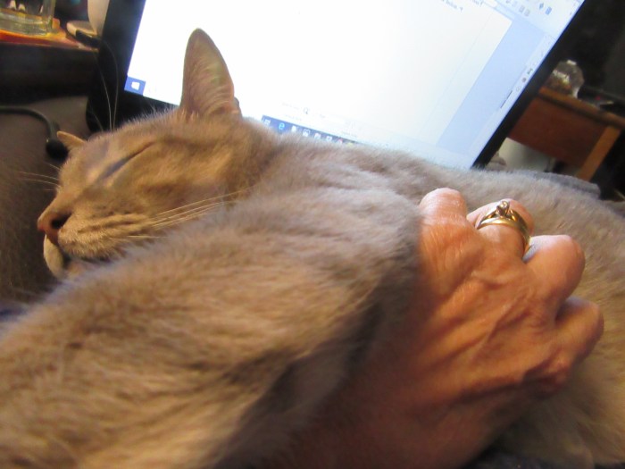 And he’s a Velcro cat. He can’t help that I have to move the laptop waaaaay over to the left and stretch sideways to reach the keyboard. He needs almost constant physical contact. Denying him my lap could crush his spirit. He’s sensitive.