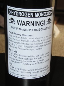 And I received a thermos bottle for Dihydrogen Monoxide with many WARNINGS on the side, such as, “Take