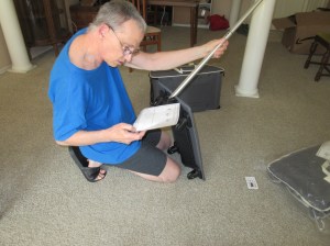 My gifts to David weren’t nearly so imaginative. One required reading instructions. A dirty trick. But on the theory that we have reached a certain age, and that the cats have reached a certain weight, and that we might need to evacuate the apartment quickly–I’m the type who sleeps in her clothes during tornado watches–I gave him two rolling cat carriers. They arrived in pieces. The manufacturer says if you leave them open, the cats will use them as beds and so will be happy to be stuffed inside and wheeled down the sidewalk. Yeah, right.