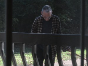 Unable to enter, snake went along and went along. David got the big square meter stick, compliments of the Lockhart State Bank back in the ’60s, went outside, reached over the grille work, and flicked the snake off the patio. It took several flicks, but David was gentle. The snake looked surprised and a little disgusted at being launched into flight and landing on the rocks outside. But he showed no sign of pain.