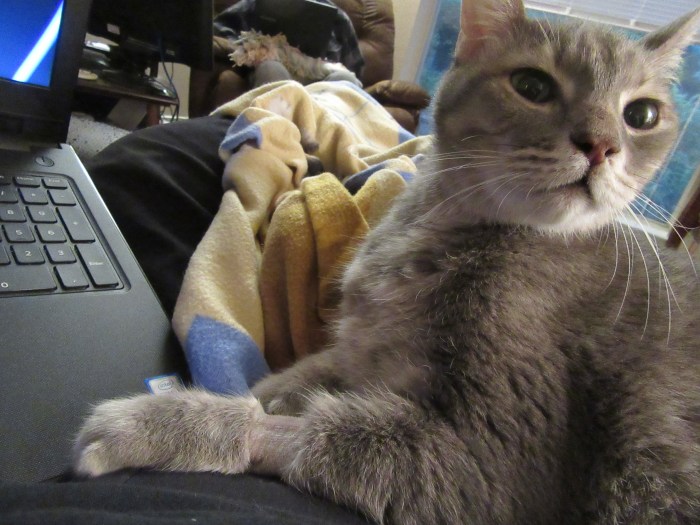 While was in Dallas at a writing conference, David noticed symptoms of diabetes and took Ernest in for confirmation and treatment. I asked how he got the cat into the carrier. “With great difficulty,” he said.
