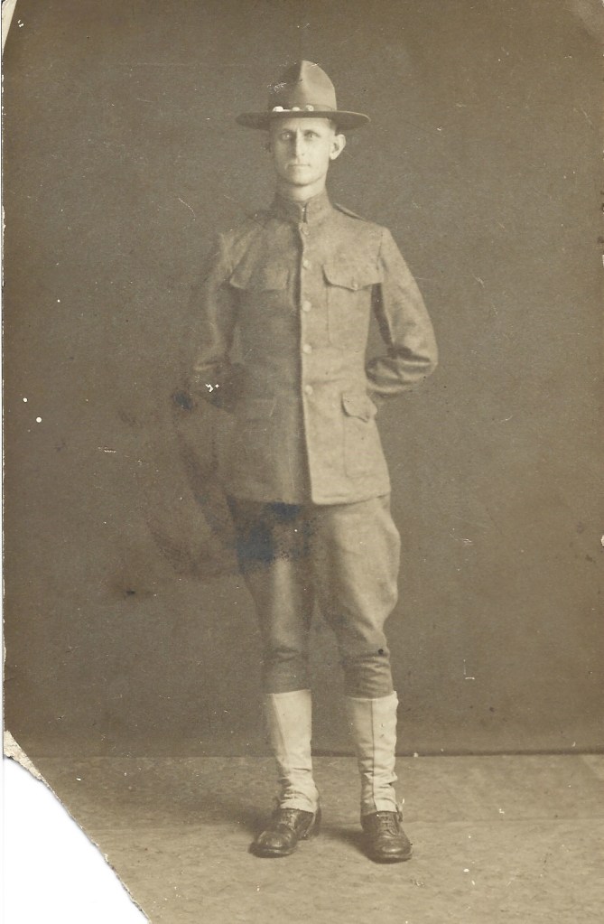 Thirty years old when the United States entered World War I, he enlisted in the army and served overseas. A transcription of a letter he sent to his mother and his sisters, Ethel and Jessie, appears above.