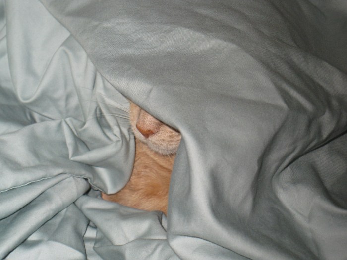 I got tired of sitting, so I went upstairs, closed the bedroom door behind me, lay down on the floor, and looked under the bed. It took a few moments, but Ernest’s big eyes finally became visible. I wished, as I do every time he hides under there, that the bed weren’t queen-sized. And that it weren’t built so low to the ground. Why do they do that?